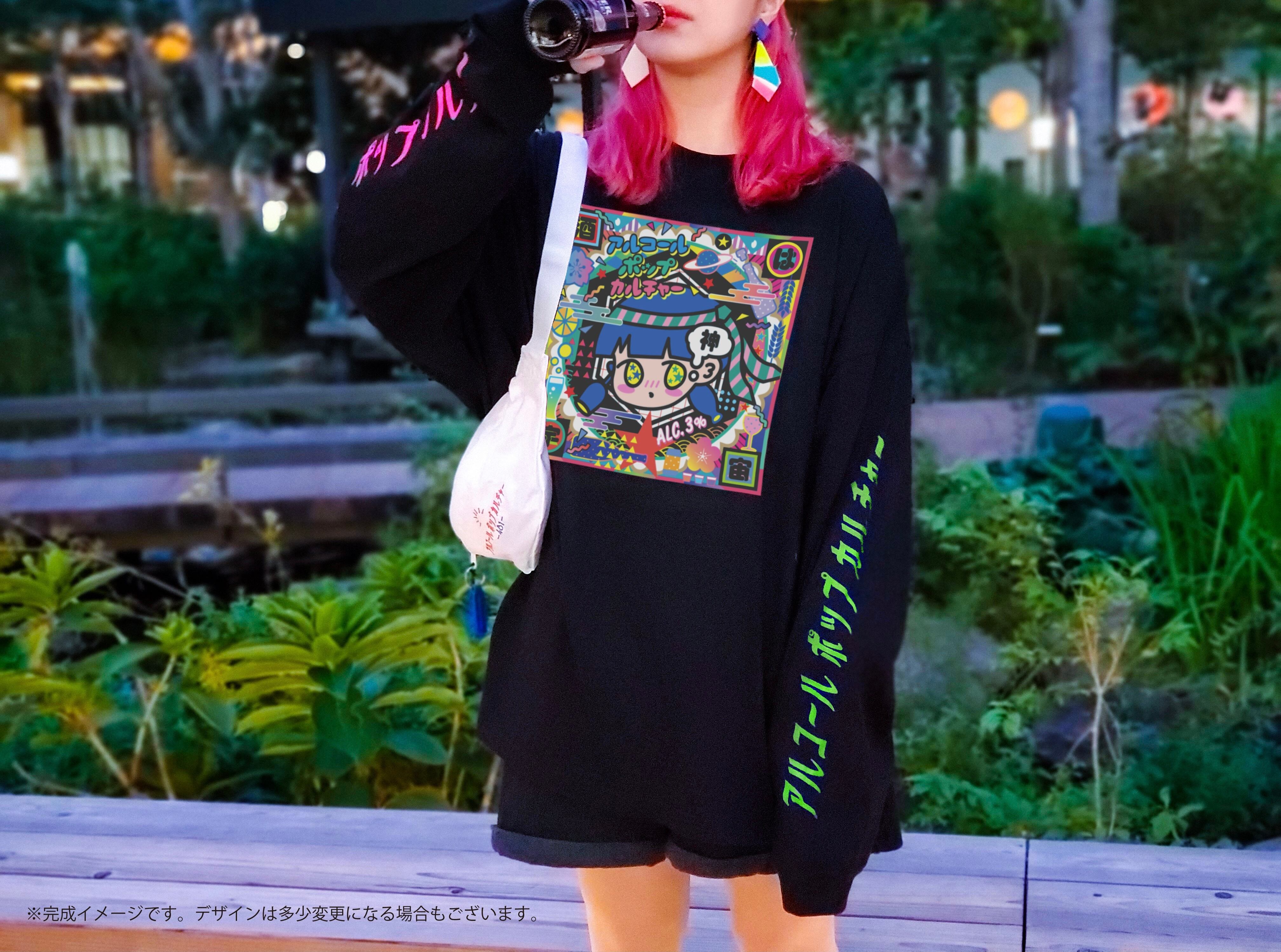 去年の秋のデザフェスにて発売した様々なお酒のモチーフやラベルが隠れている『酒は宇宙』ロンTの《ほろ酔いver.》を通販限定で再販します。基本的なデザインはそのままですが女の子や袖ロゴの色など他にも少しずつ変えていますので、《泥酔ver.》を持っている方もぜひ!サイズはXL、カラーはブラックのみになります。ダボっとかわいくかっこよく酒に溺れましょう。